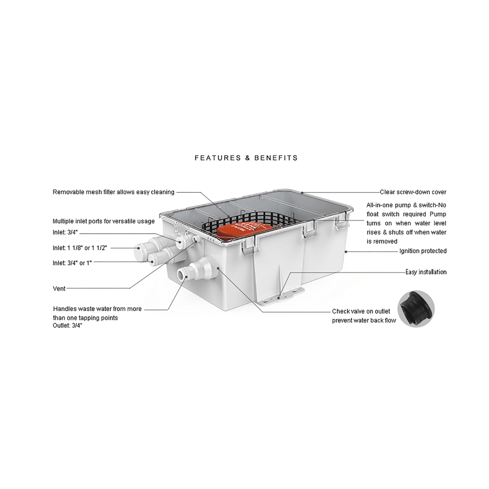 - Contains All-in-one pump & switch - turns on when water level rises & shuts off when water is removed